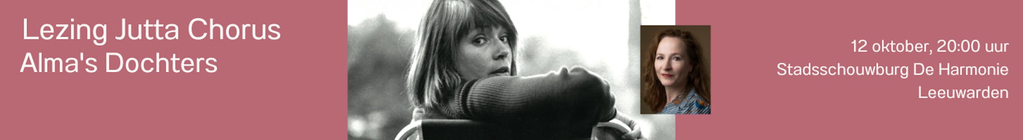 Op 12 oktober geeft Jutta Chorus een lezing over haar boek Alma's dochters dat eind 2022 verscheen in Stadsschouwburg De Harmonie in Leeuwarden. Meer informatie volgt.