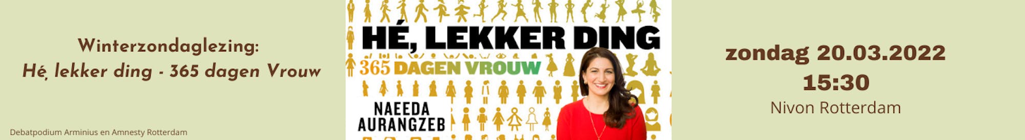 Samen met Amnesty Rotterdam organiseert Debatpodium Arminius op zondag 20 maart 2022 een lezing over genderdiscriminatie. Hier zal Naeeda Aurangzeb haar nieuwste boek 'Hé, lekker ding - 365 dagen vrouw' bespreken.